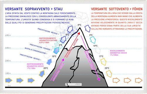 When a mass of air mooving with a certain speed perpendicularly impacts against a vertical obstacle, such as a mountain range, the air mass is forced to rise (the movement of the mass of air is so fast that it has no time to have any heat exchange with the surrounding environment; in physics this is called adiabatic process).