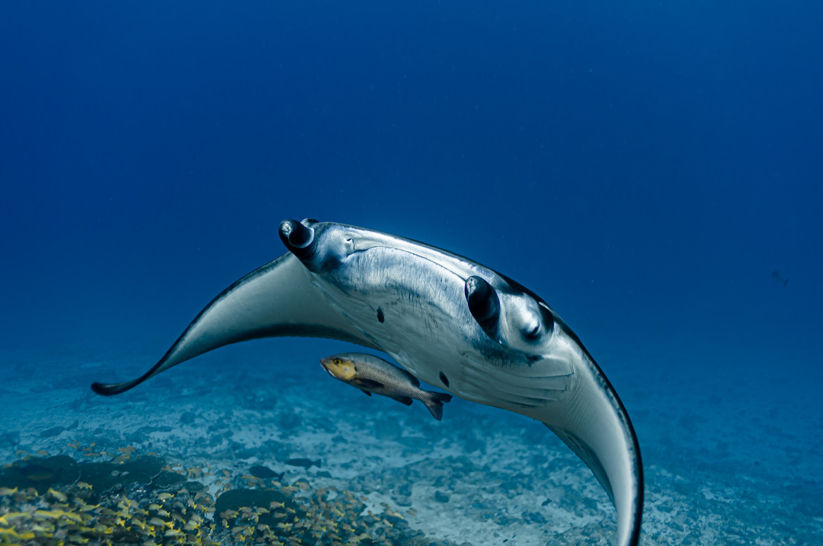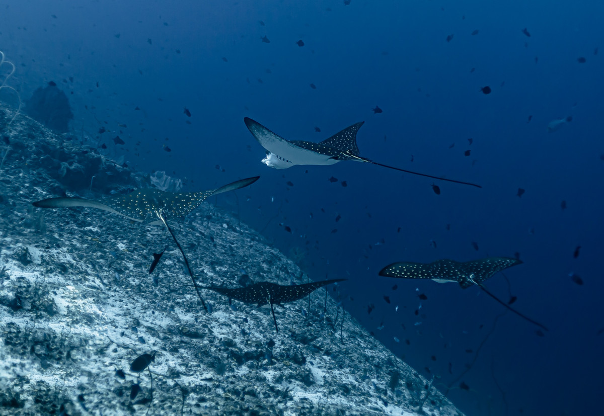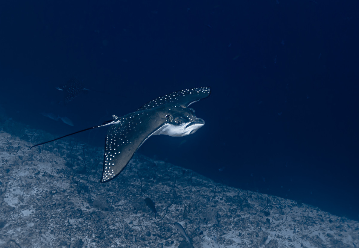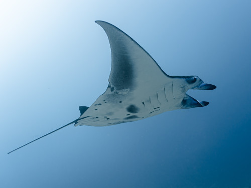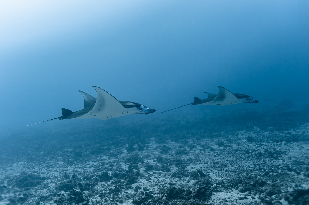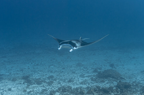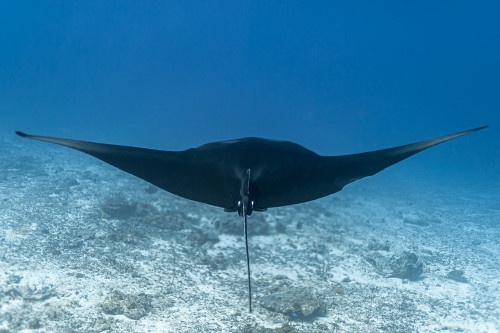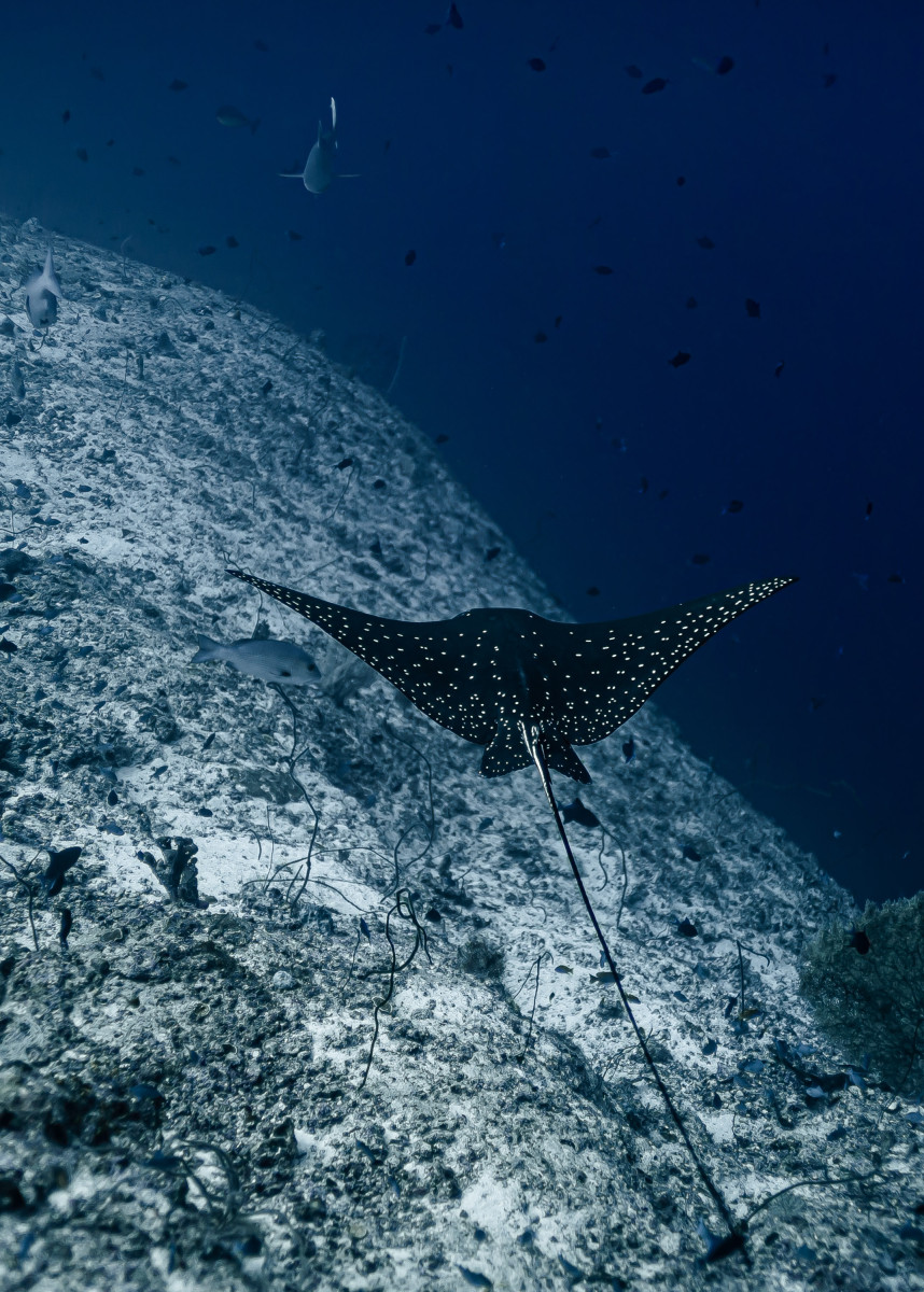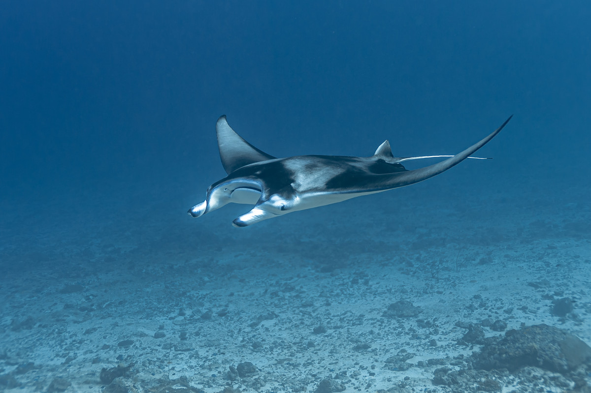 In just ten minutes of sailing westwards you end the canal by reaching the Indian Ocean. This is where is located one of the most exciting dive sites in the Maldives as the combination of strong currents and nutrient-rich waters create the perfect habitat for large groups, sometimes as many as fifty and more specimens, of different pelagic fishes. Diving close to 40 meters deep of the drop-off will be possible to encounter giant trevally, barracudas, manta rays, eagle rays, sharks and whale sharks.