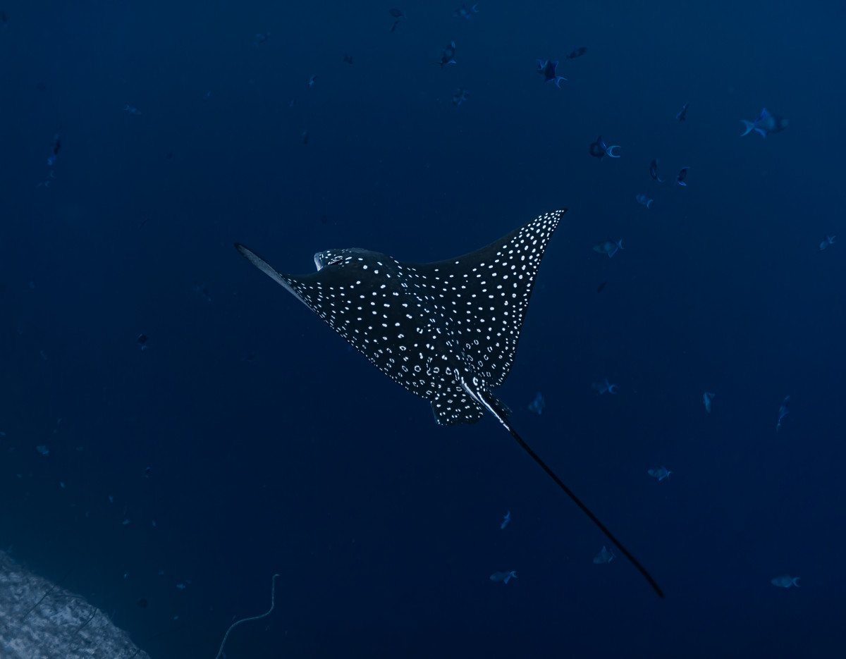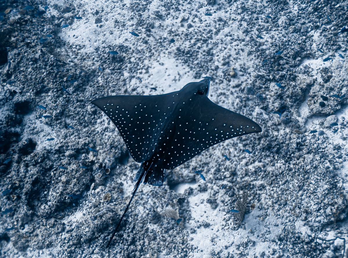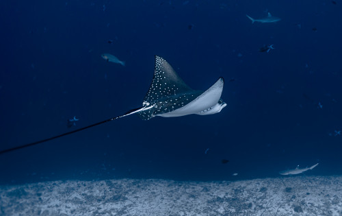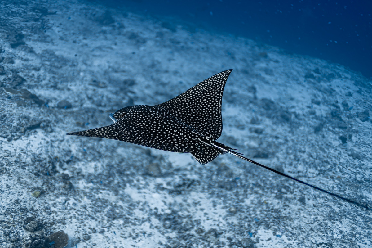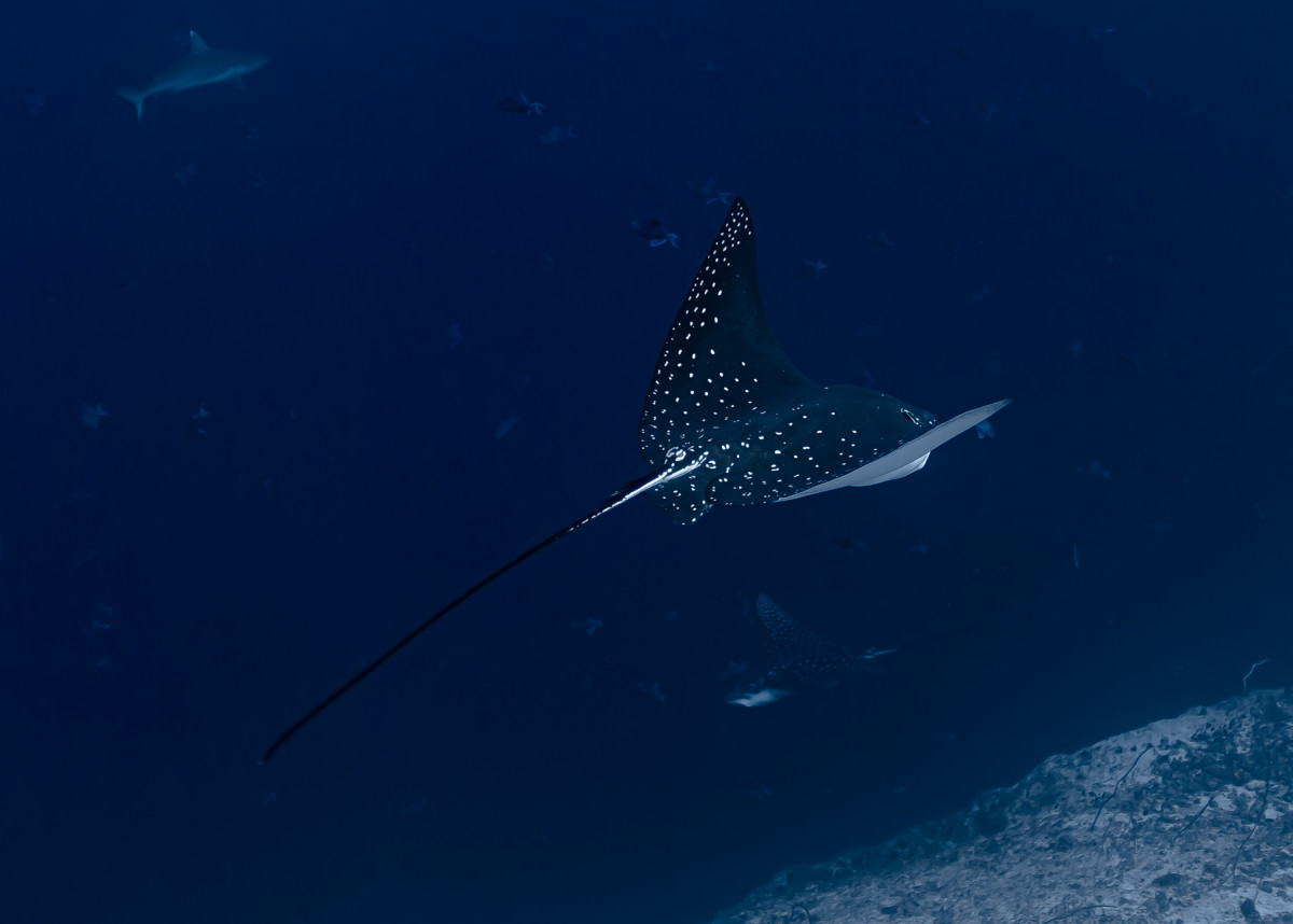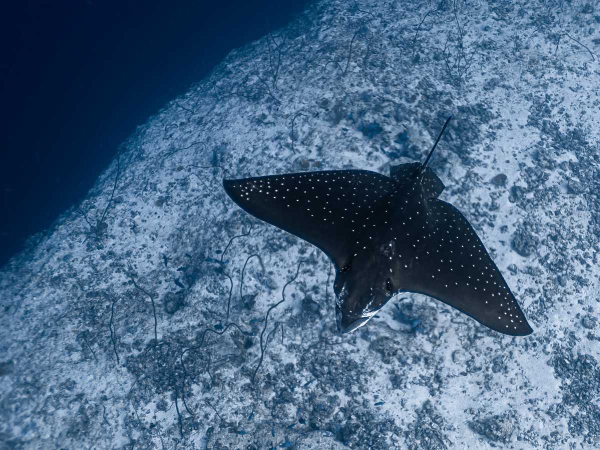 In just ten minutes of sailing westwards you end the canal by reaching the Indian Ocean. This is where is located one of the most exciting dive sites in the Maldives as the combination of strong currents and nutrient-rich waters create the perfect habitat for large groups, sometimes as many as fifty and more specimens, of different pelagic fishes. Diving close to 40 meters deep of the drop-off will be possible to encounter giant trevally, barracudas, manta rays, eagle rays, sharks and whale sharks.