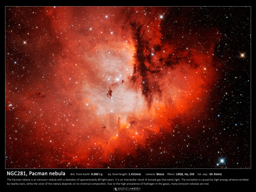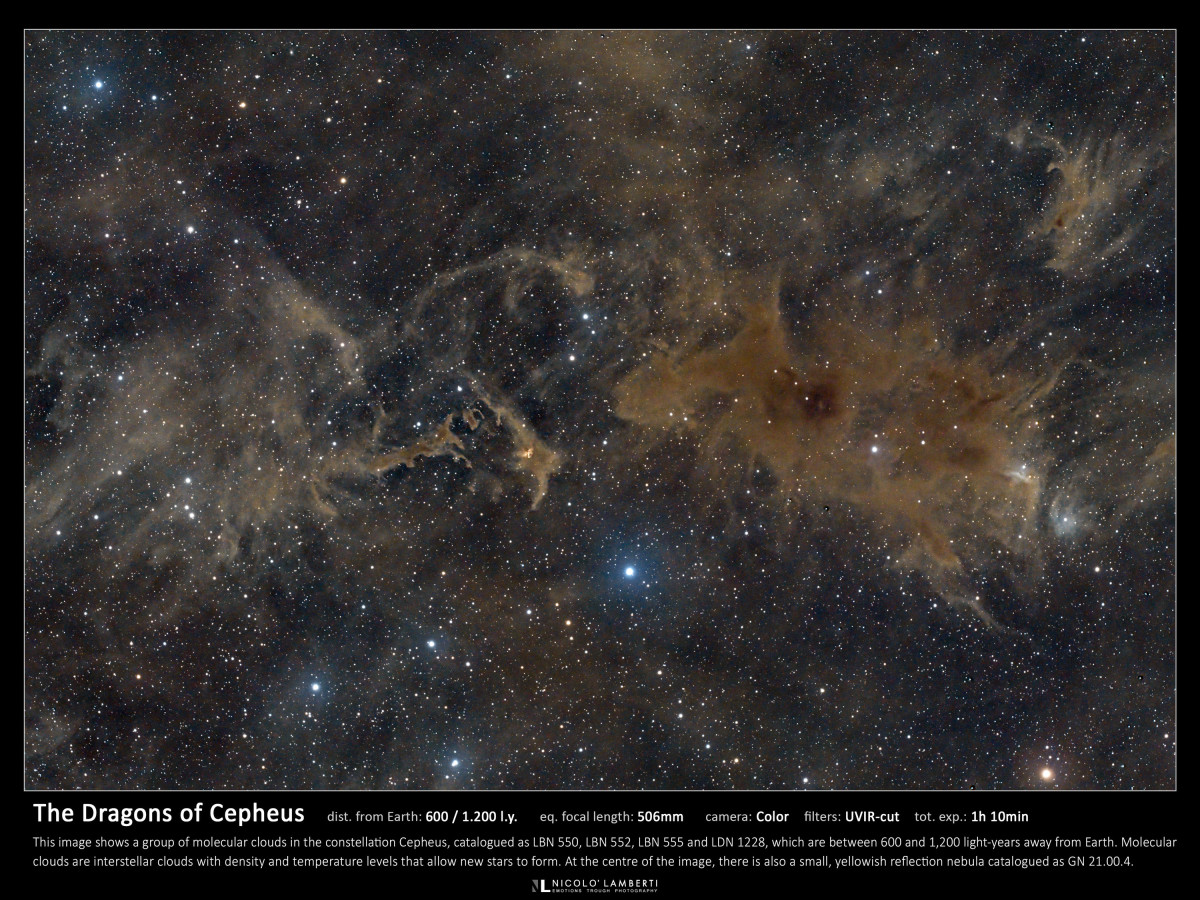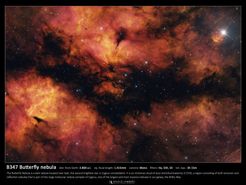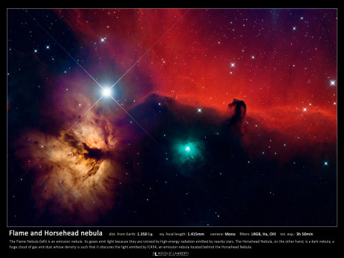They are those nebulae where the quantity of dust present in them is so high as to block the visible light radiation coming from the regions behind. These nebulae therefore appear as black clouds that can be observed only when they obscure a luminous object behind them like a star, or an emission nebula or a reflection nebula. The latter is the case of the famous Horsehead Nebula, a dark nebula that overlaps with IC 434, a nebula with very bright emission.