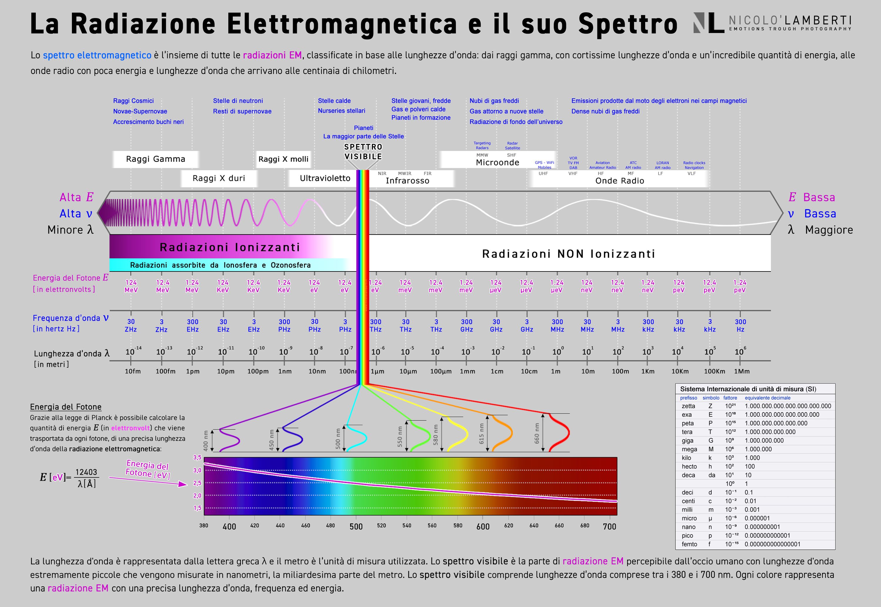 La radiazione elettromagnetica (radiazione EM) è un tipo di energia che si propaga nello spazio, sotto forma di onde, ad una velocità costante: la velocità della luce. Negli atomi, ad esempio, la radiazione EM viene generata quando il campo elettrico e magnetico dell’elettrone, subisce una variazione.