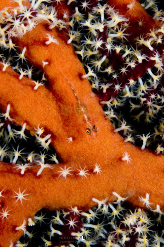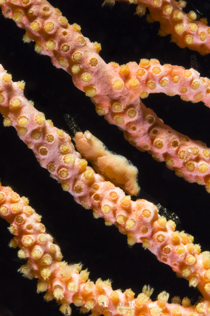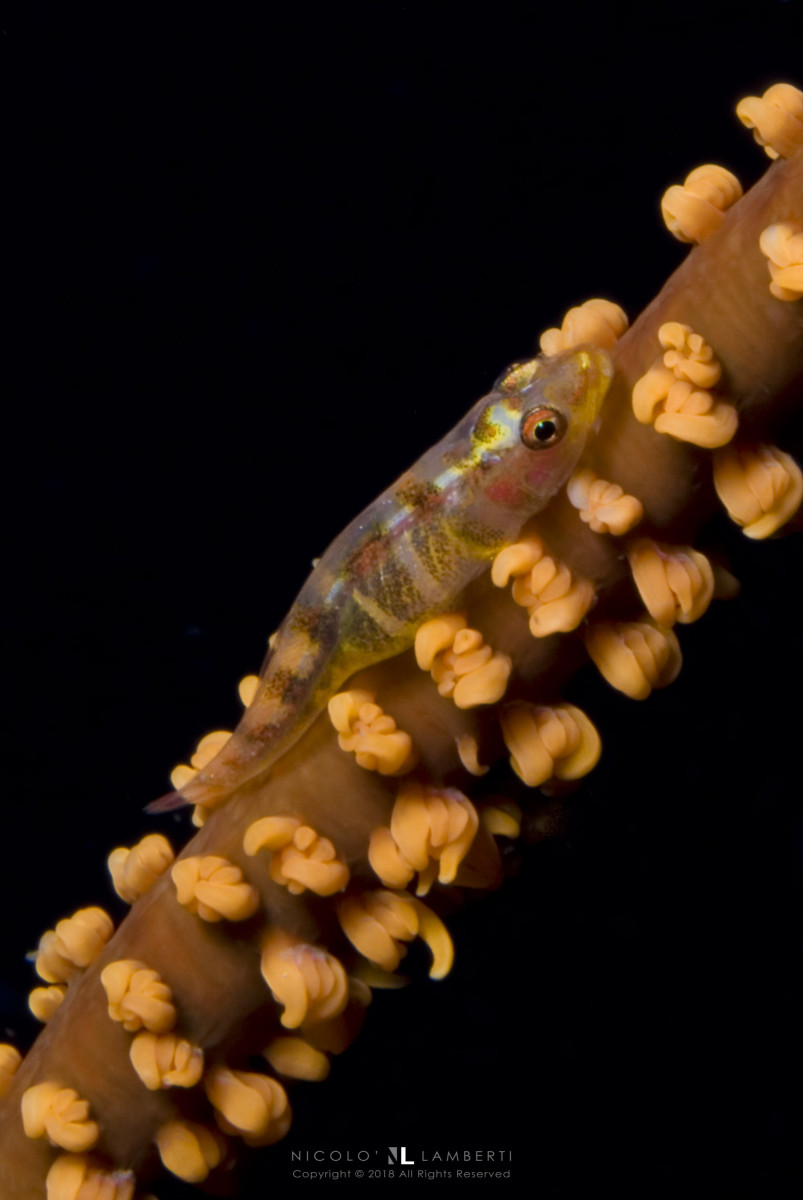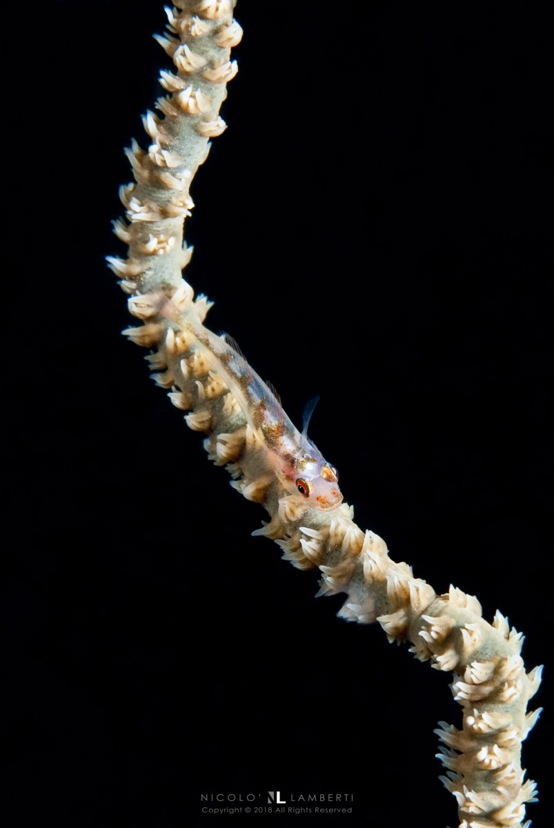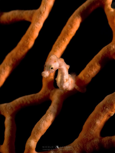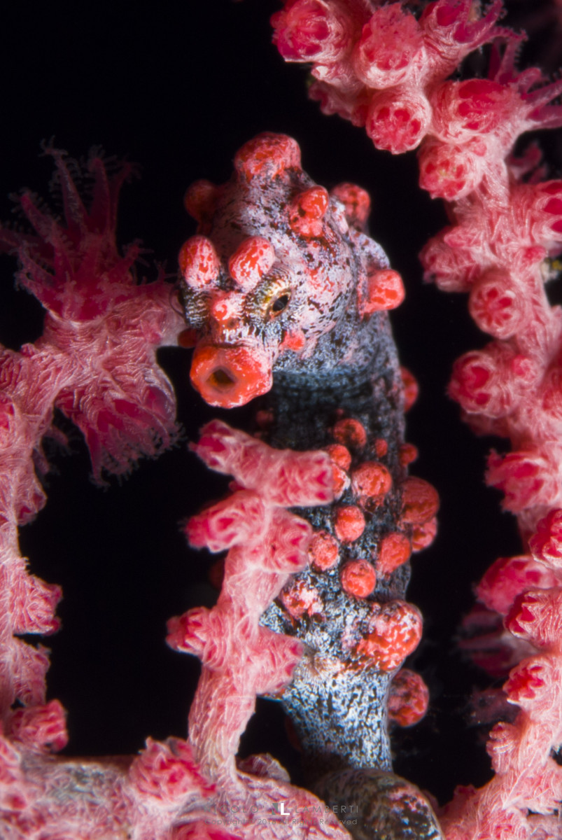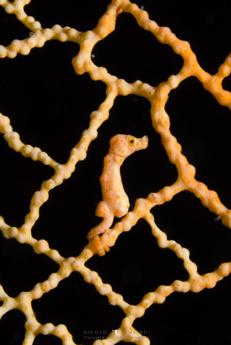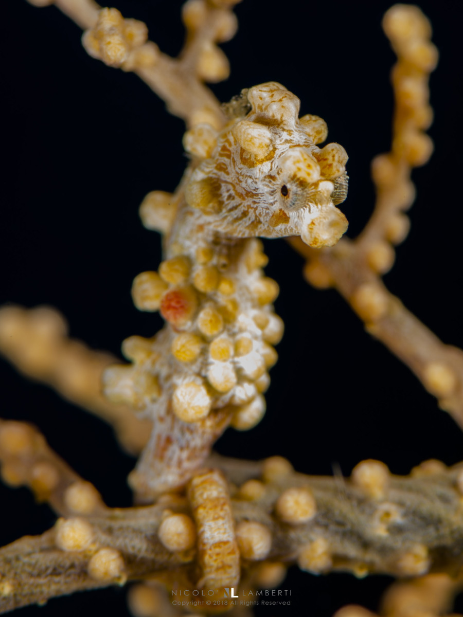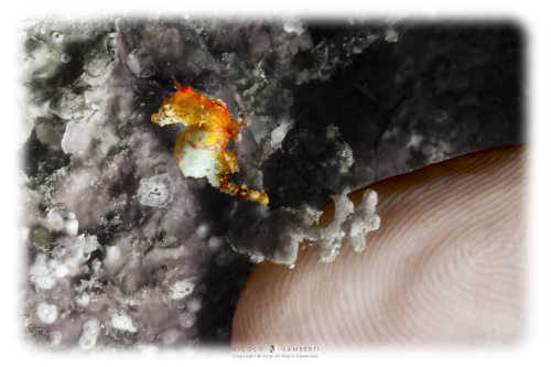 La Macro Fotografia ci permette di ammirare i dettagli più microscopici ed incredibili del mondo sottomarino. In questa foto l'aver ripreso una parte di polpastrello aiuta a dare un'idea delle piccolissime dimensioni dell'esemplare di cavalluccio pigmeo Pontohi che è lungo circa 6 mm.